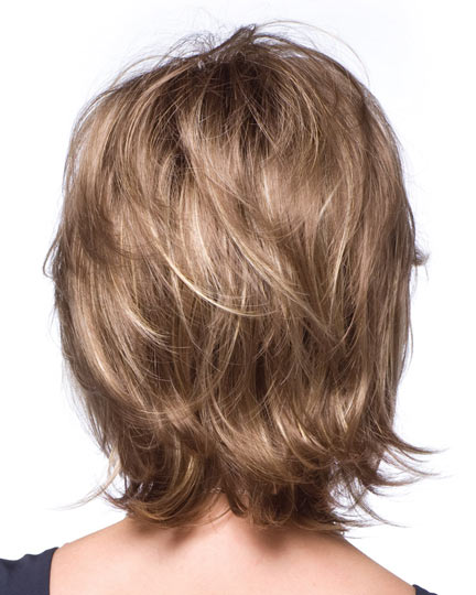 Claire by Noriko for Rene of Paris is a mid-length layered wig with flipped, textured ends and a side swept bangs.