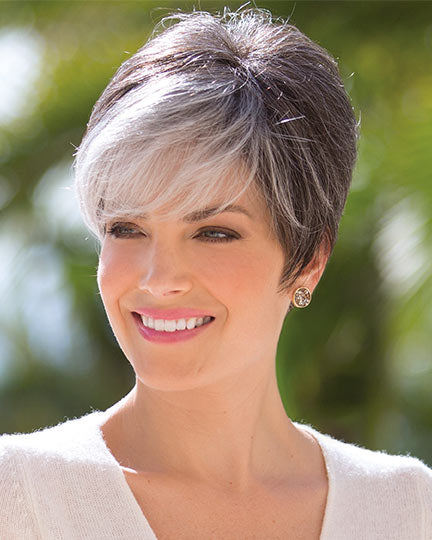Eva by Noriko for Rene of Paris features a chic swept fringe with a tapered nape for an updated pixie look.