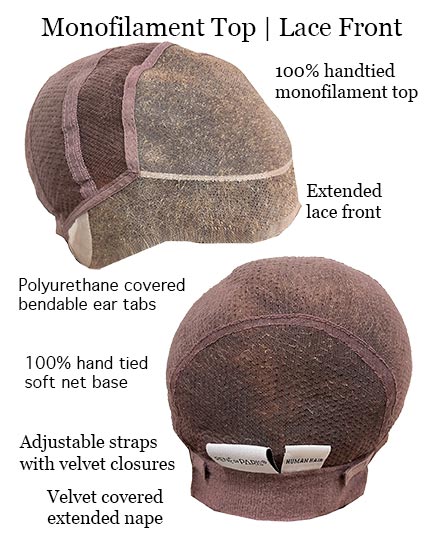 Rene of Paris Alina wigs feature a ready to wear lace front monofilament top with a 100% hand tied cap. The monofilament top creates the illusion of natural hair growth where it is parted while the 100% hand tied closed wefted cap with their individually hand knotted hair provides Alina with natural movement.