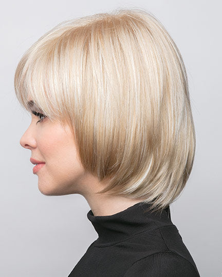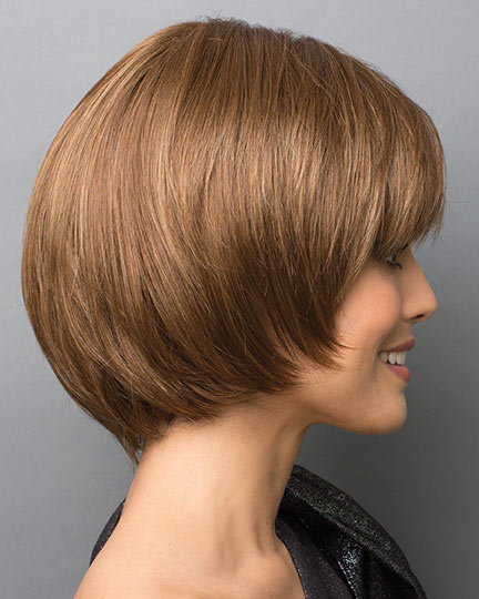 Shannon by Rene of Paris is collar length, smooth layered bob with chipped ends and wispy face framing fringe bangs.
