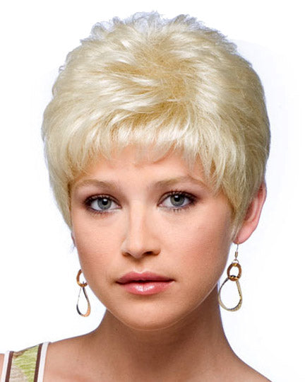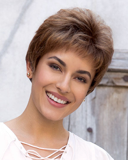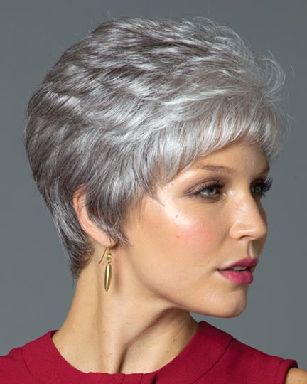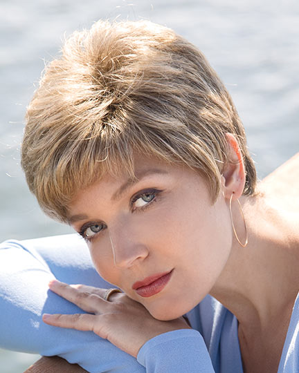 Pam by Noriko for Rene of Paris has short feathered layers with wispy bangs. Classic yet chic.